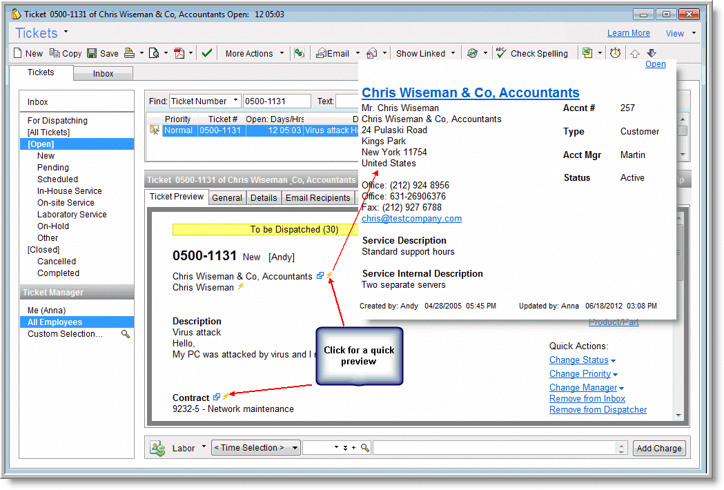 Along the way a ticket could be viewed and acted on by numerous people within the company and can involve appointments for on-site technician visits and/or online remote access support or just simply answering questions. It can also involve work on various assets, generate an array of charges for different types of work, depending on the contract that specific customer has with the company, and result in detailed reports showing the work done and charges added.