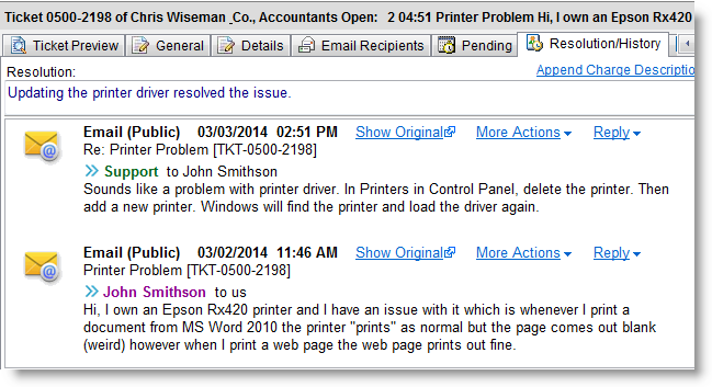 The Email Connector manages email threads for you. If a customer replies to your support email in regards to a specific ticket, or if you, as a technician, reply to the customer, the correspondence will be automatically filed under the ticket in the system and distributed automatically to the recipients defined for the Ticket.