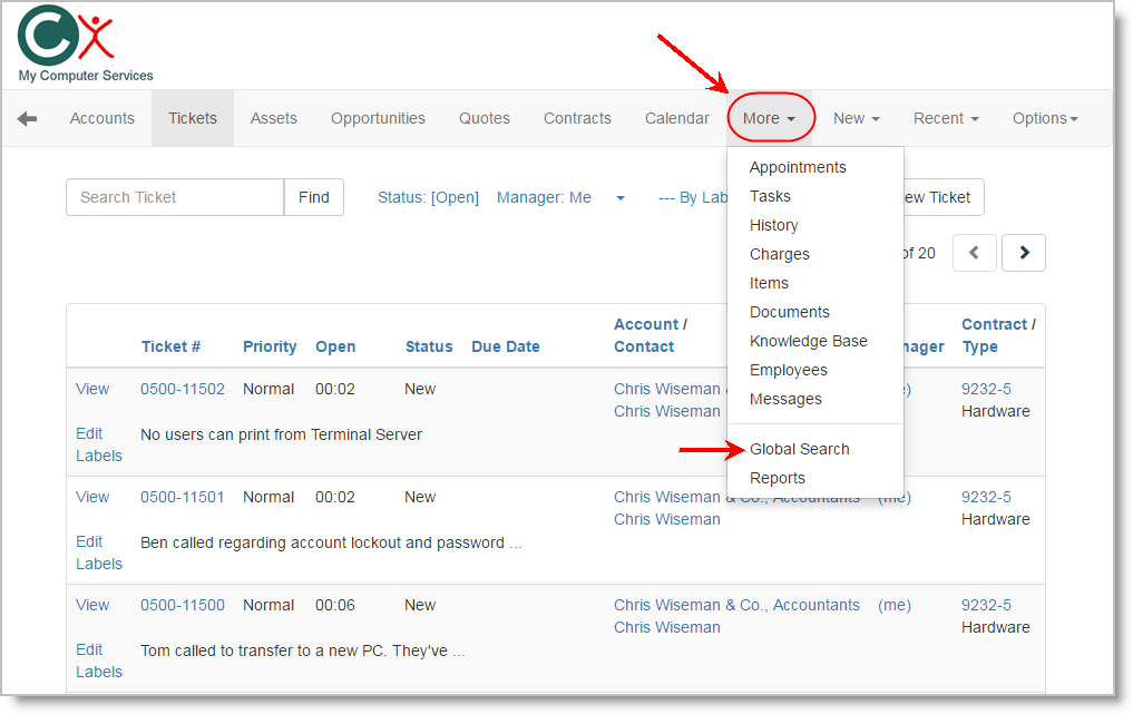 Global Search – The recently added powerful global search feature is now available from the Web portal. Quickly access it from anywhere to search your entire PSA and CRM database from the road.