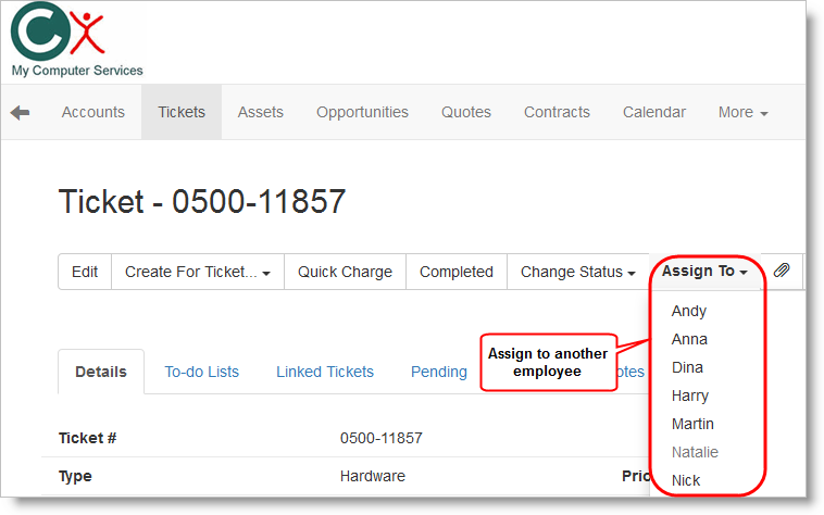 Assigning Tickets to employees is now easier than ever. A new drop-down option allows you to re-assign a ticket directly from the Tickets List as well as from the Ticket details page. You no longer need to Edit the Ticket in order to reassign it (though this option is still available when editing the Ticket).