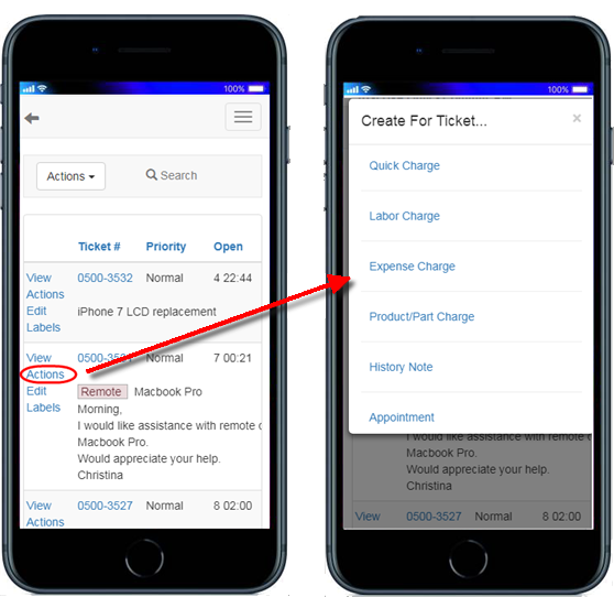Save plenty of clicks and taps (mobile!). Initiate actions directly from lists!Add a new Charge to a ticket, add a new Note to an account, add a new Task and more.