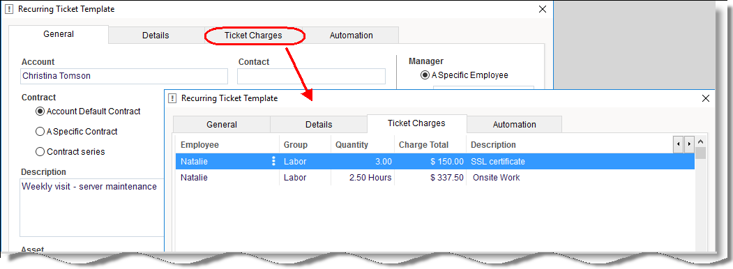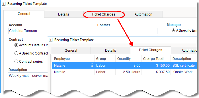 Recurring Tickets are created automatically based on a predefined schedule. In this version, we added the option to add pre-configured Charges to these tickets. This way you can automate recurring tasks that you need to bill for and track their activity. It also prevents you from forgetting to log Charges for recurring activities, because you can define all required charges in advance and they will be added automatically to the recurring ticket.
