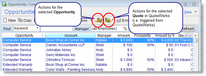 Within our CRM’s Opportunities window, there are two QuoteWerks icons. The first icon enables you to work within the app on a selected Opportunity and link the Opportunity to QuoteWerks Quotes. The second icon enables you to work on QuoteWerks Quotes and link all activities performed in QuoteWerks to specified Opportunities.
