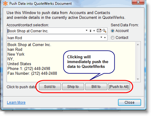 Whether you choose to work from within the CRM app or QuoteWerks, by using the bi-directional integration, you only have to enter data, including Account/contact information, once. Account and Contact information is easily pushed from the CRM to QuoteWerks so that you no longer have to manually enter client information.