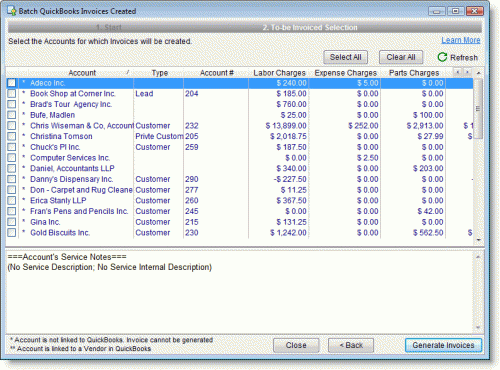 Once selected, you can create batches of invoices at once at either the customer, service contract or ticket level.