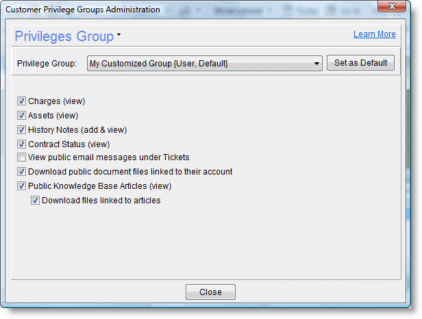 Note: When upgrading to RangerMSP 5.5, your customers will have the same access as before. The upgrade program creates a new custom group automatically, based on the current Web Interface customer privileges settings defined under Tools > Options > Web Interface. This custom group is automatically assigned to all customer Web users and becomes the default group for new customer users.