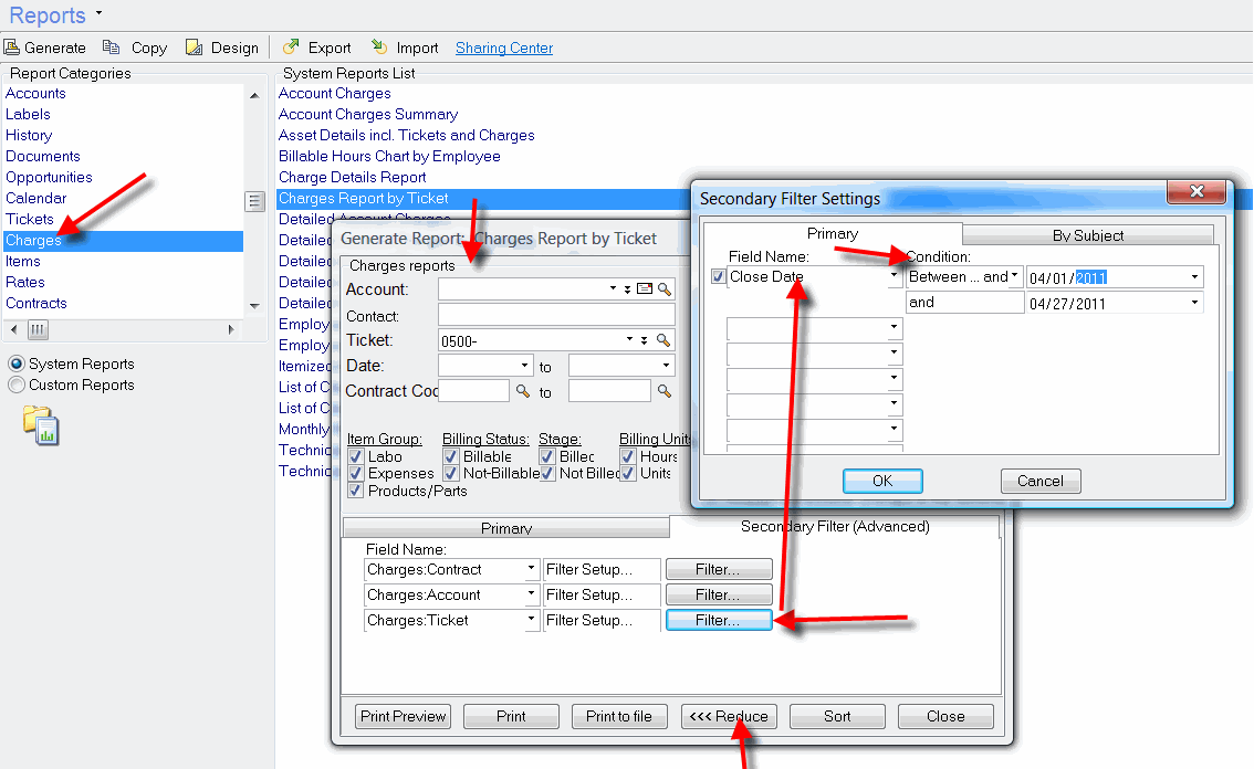 A Tickets filtering Window will now open. Select the filtering criteria to only list Tickets with a Closed date between two dates you specify (and/or Status='Completed', etc.) and you're done. Print the report and only Charge records from Completed Tickets will be printed.