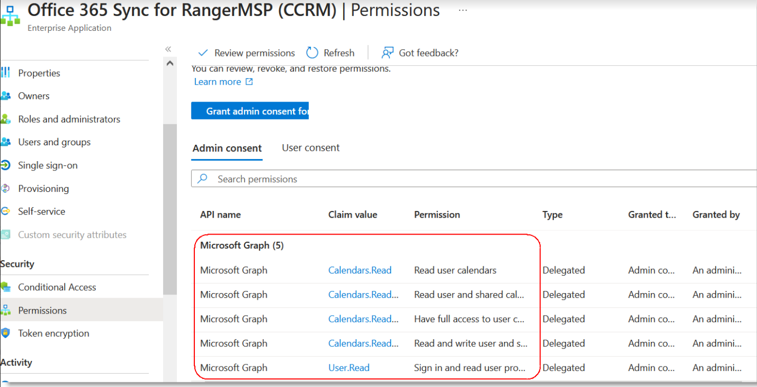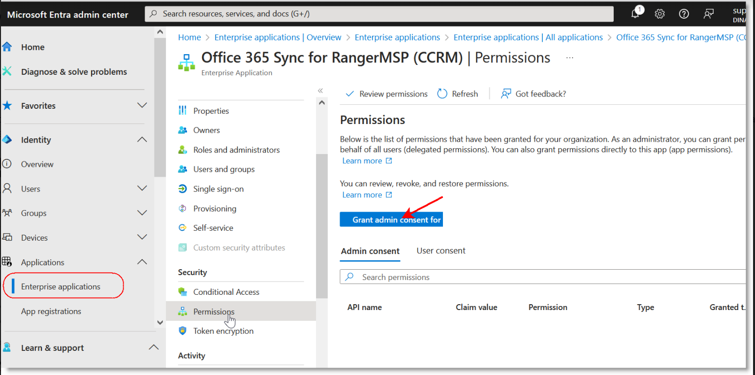 1. Log into your 365 account using an administrator user, go to Microsoft Entra Admin Center > navigate to the Enterprise Applications section, select the RangerMSP application ("Office 365 sync for RangerMSP"), approve it and consent on behalf of the Organization as an Admin. This would re-"mark" the app as an allowed for the organization and may help resolving/bypassing the current issue.