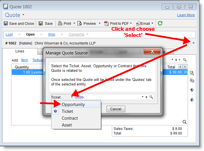 Yes, you can link an existing Quote an Opportunity - when viewing the Quote details at the top right side of the Window there is an arrow that allow to link the quote to opportunity/ticket/contract/asset: