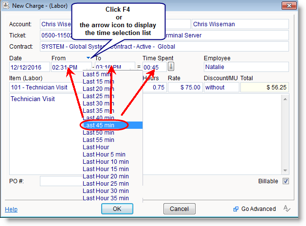 Adding Charges is even easier now as it can be done by selecting the time span from a drop down list of periods, such as Last 45 min or Last 2 Hours which will then automatically fill in the Start/End times for you, saving you from having to type it all in each box manually.