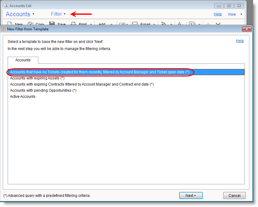 The following filter can be activated while viewing the Accounts window. It lets you very quickly see a list of Accounts that have no new Tickets created for them recently.