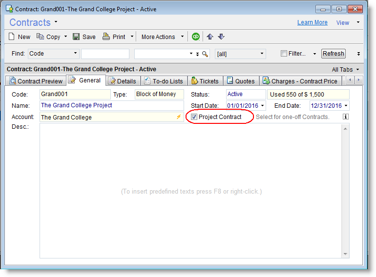 Project Contracts are treated as one-off Contracts and will not be included when you renew all Contracts for next month using the batch renewal feature.