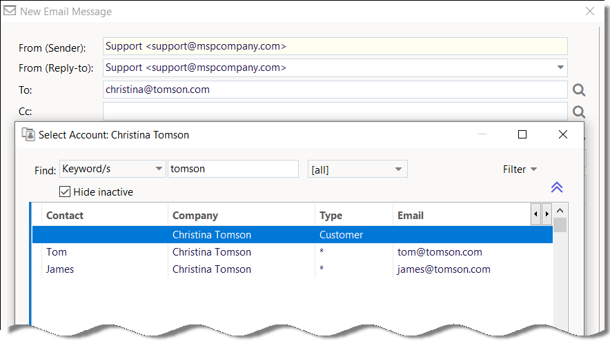 The recipients’ email addresses are automatically taken from the record you send the email from. It takes the customer’s account email address, the contact, other recipients that may be listed for tickets, and more.