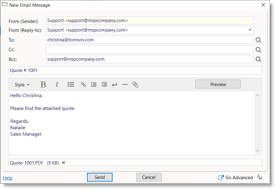 New email messages can be sent from any window within RangerMSP simply by clicking the existing ‘Email’ button or using the ‘Send Email’ menu option.