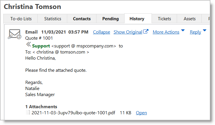 Emails are automatically filed in RangerMSP under the relevant entity – Customer Account, specific Sales Opportunity, relevant Asset or Ticket, etc.