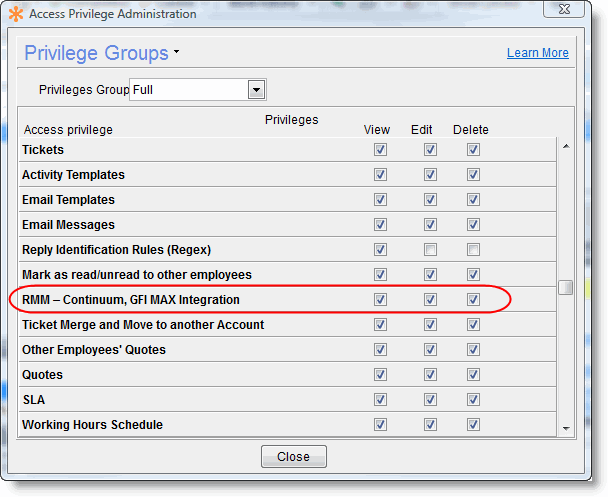 - Choose the relevant group from the drop down menu and make sure that the RMM-Zenith, GFI MAX Integration privilege is selected.