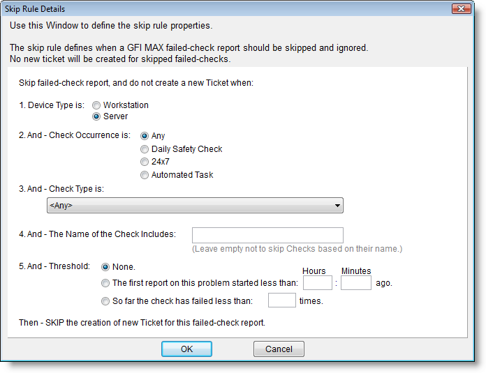 GFI MAX Skip Rules tell the system which automated failed checks (which were received from GFI MAX) can be skipped and ignored, and no Ticket will be created for them in CommitCRM.