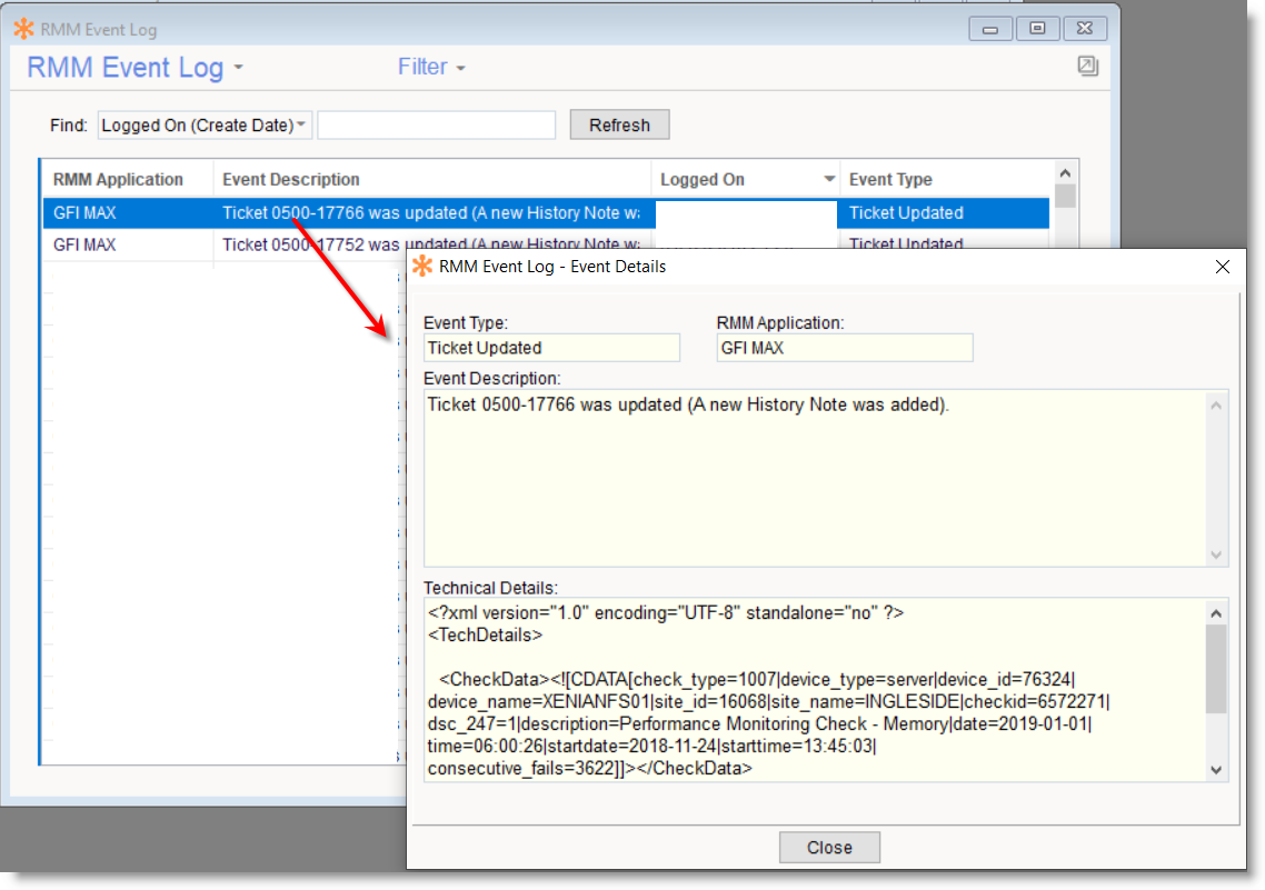 - Technical Details: shows the actual XML that was received by the GFI MAX integration.