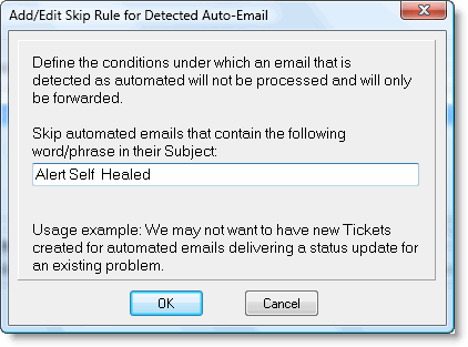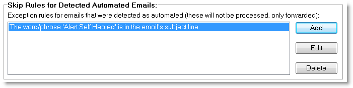 • Word/phrase in email's subject line - Once an email has been identified as an automated email, these Skip Rules tell the system when the email should be skipped and sent to an internal email address. Enter words or phrases here that you want the system to use to identify emails that should be skipped.