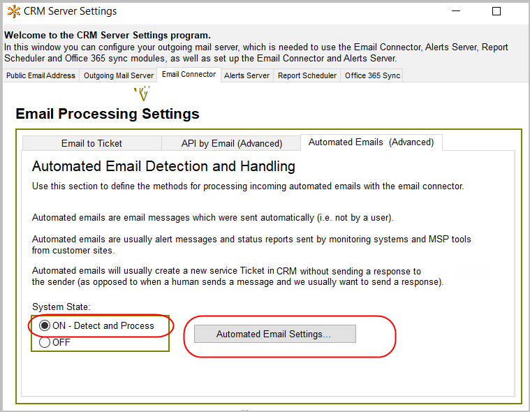 Setting up the Automated Emails section is optional and is required only when working with external systems (such as external MSP system) which send formatted email alerts to the Email Connector.