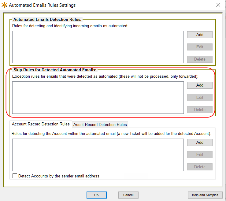 The Skip rules tell the system which automated emails (which were already detected as automated emails with the detection rules) can be skipped and automatically forwarded to an internal email address, without being processed.