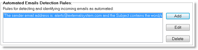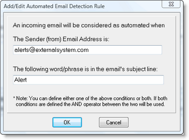 In this example, any email which comes from alerts@externalsystem.com, and contains the word "Alert" in the email subject line will be detected and identified as an automated email.