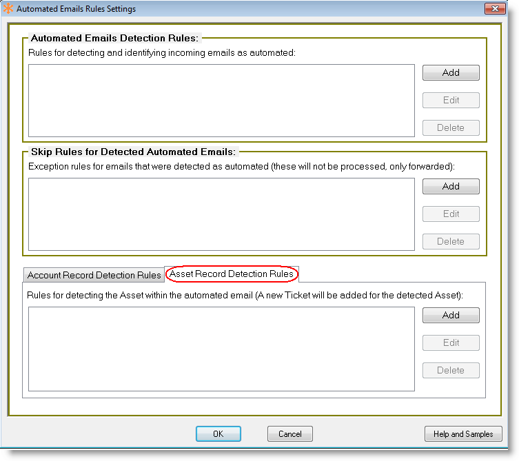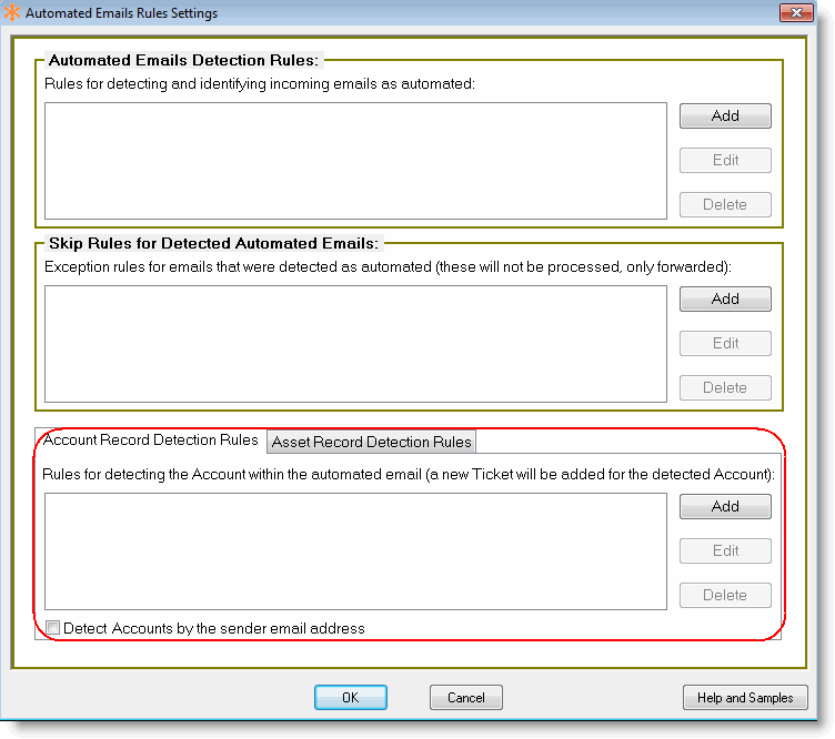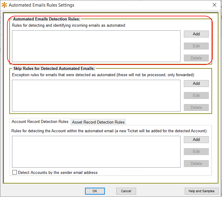 You can define rules for each section, and they will be processed in the order in which they are entered. The first rule that the process comes to that applies will be used. If no rules apply, the email will be identified as not "automated," and will then be processed as a "regular" email connector incoming email and sent to the support email address defined for these types of emails..