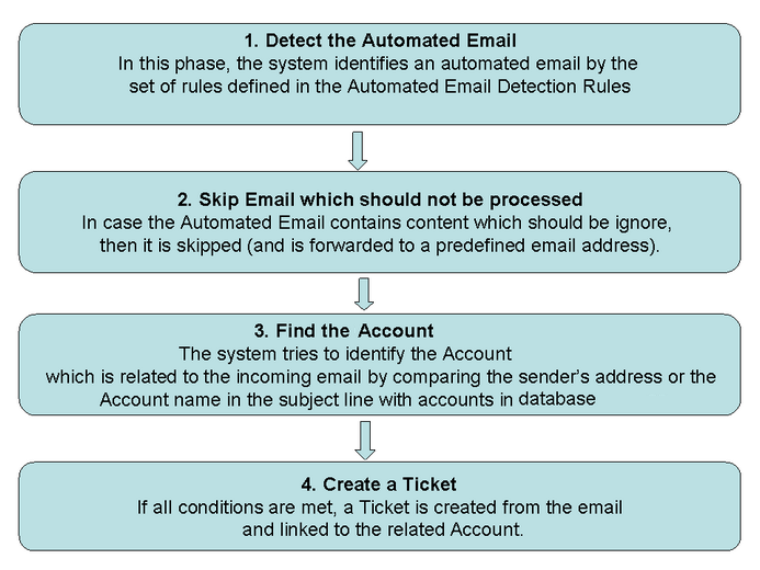 To set up the Automated Emails detection rules, you should start by understanding the work-flow, as described in the Automated Email Processing Flow section below.