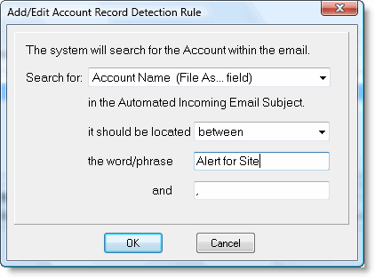 In this example, the system will search for the Account Name or Record ID in emails which were detected as Automated and were not Skipped. If the subject line contains the phrase "Alert for Site," it will then take the phrase after this, and before the next comma, and will check if the Account Name appears there to see if it should search for the Account in RangerMSP.