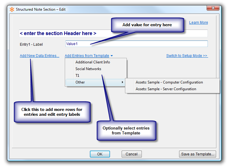 Adding new entries to a section is done from the Structured Note Section window. Note: To add from a template, click the arrow near the menu option and choose the template you want to use. To add new entries, click Add New Data Entries, or Switch to Setup Mode.