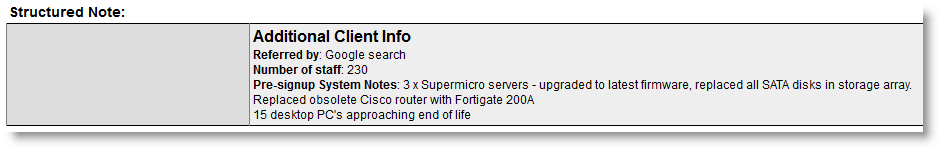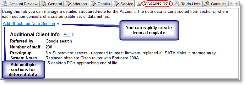A Structured Note is basically a way to easily store custom data. You can create a Structured Note containing any data you want in whatever data entry sections you need, and you can save it as a template to reuse again and again. You can even have multiple Structured Note sections applied to each Account.