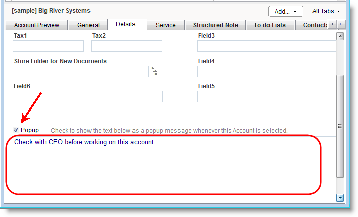 Each Account contains a 'Popup' field in the Account's Details tab. The Account 'Popup' field lets you define a popup message, which will be displayed when attempting to use this Account. This feature is helpful if you want to be reminded about money issues or any other matter with a customer whenever viewing their details or choosing the Account.