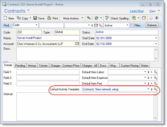 To assign a Linked Activity Template to a contract, go to the Contract's Details tab and click on the Linked Activity Template field. A pull-down menu appears, allowing you to select any active Contract Activity Template.