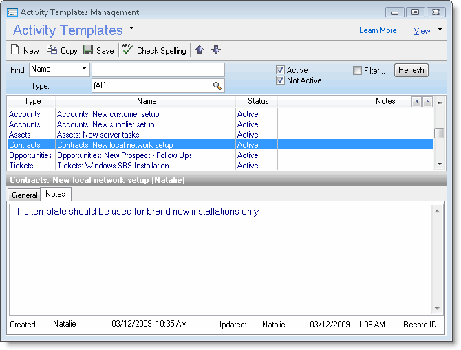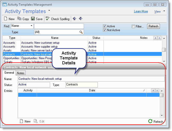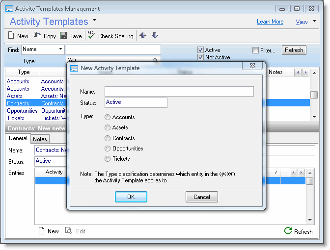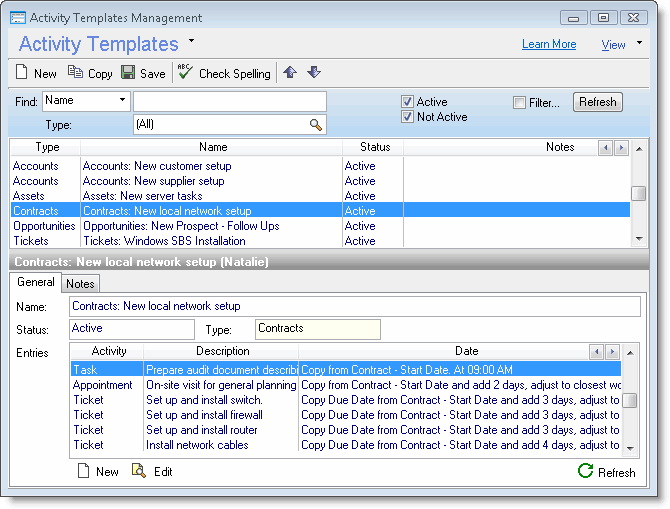 Applying an Activity Template creates the activities (Tasks, Appointments, and Tickets) based on the entries defined in the template. All newly created activities are linked to the entity to which you have applied the template. Using the right template can get you and your team started on a project more quickly and efficiently.