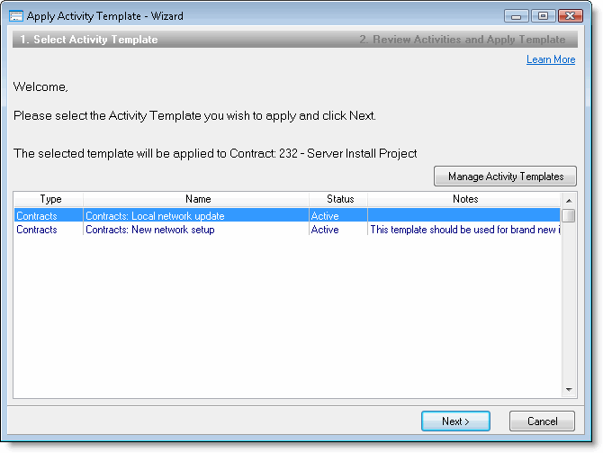 - The Activity Templates Wizard now opens. A list of all active Activity Templates for the current Type (i.e. Accounts, Contracts, Ticket, etc.) is displayed. Highlight the template you want to use, then click Next.