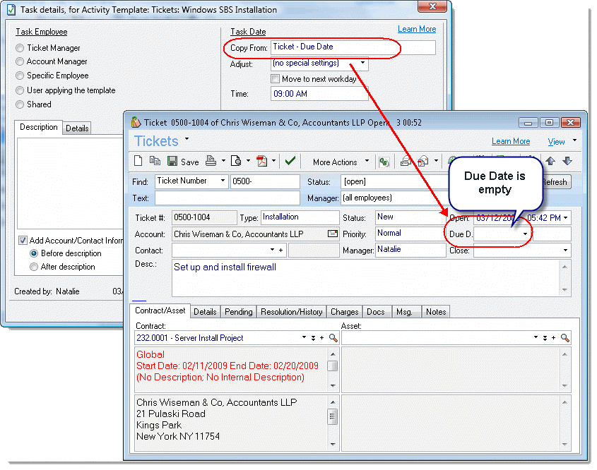 When an Activity Template is applied, certain fields are calculated according to a reference point defined in the template’s entries. For example, you may define a Task Date in a Tickets template as “2 days before the Due Date.”