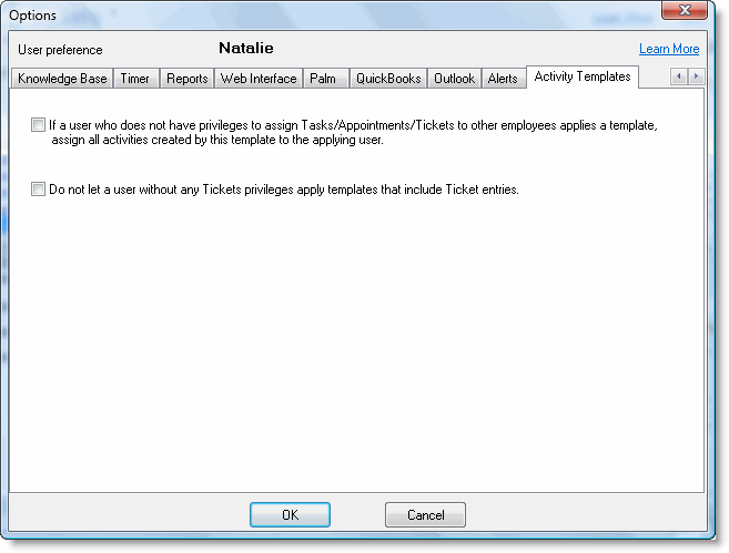 The system administrator can further restrict a user’s privileges in these circumstances by going to Tools > Options > Activity Templates (Note: this is a different area than the regular Privileges section of the system):