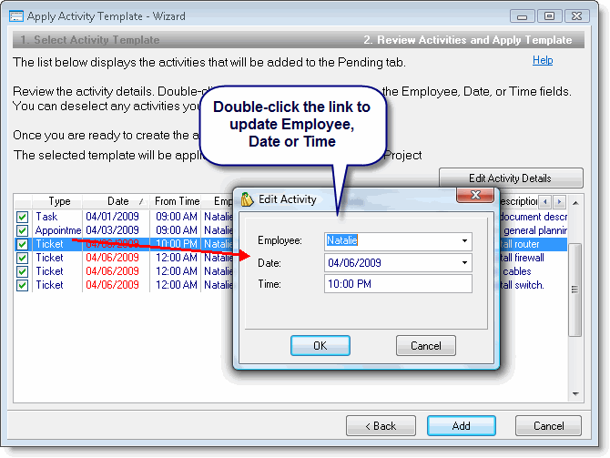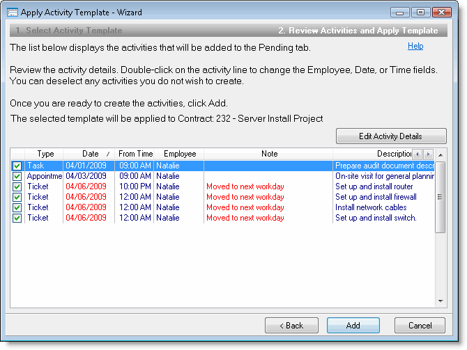 - After reviewing all the activities, verifying the data, and making any necessary changes, click the Add button at the bottom of the window to create the activities.