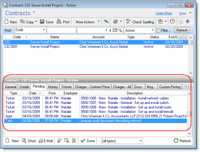 A new network installation is a complicated project that usually requires a number of tickets, tasks, and appointments. In RangerMSP, such a project is generally managed under a contract. In order to create these activities easily, you can use an Activity Template designed specifically for contracts. When the template is applied to a specific contract, the activities appear in the contract's Pending tab, showing all the work necessary to complete the job.