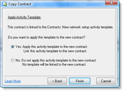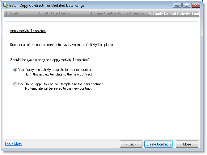 If the user selects No in this step, none of the Linked Activity Templates in the source contracts are applied to the new contracts being created, and none of Tasks, Appointments, or Tickets defined in the linked templates are created. In addition, the Linked Activity Template fields of the new contracts are left empty.