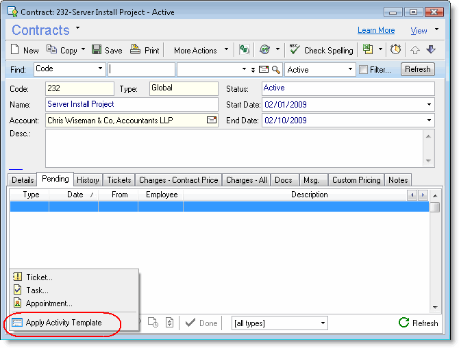 Activating the Activity Templates Wizard is done from the Pending tab of the entity to which you want to apply the template. Applying a template creates the Tasks, Appointments, and Tickets as defined in the template entries. All activities created from a template are placed in the Pending tab.