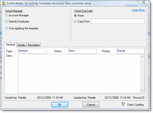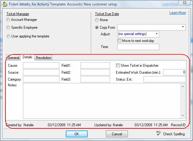 In this window you should enter the information the system can use to create the ticket when the template is applied to an account.