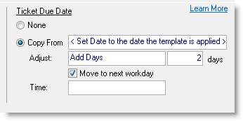 You may choose to set a Ticket Due Date. The Ticket Due Date is defined as a certain number of days before or after—or the day of—a reference date that is defined in the "Copy From" field.