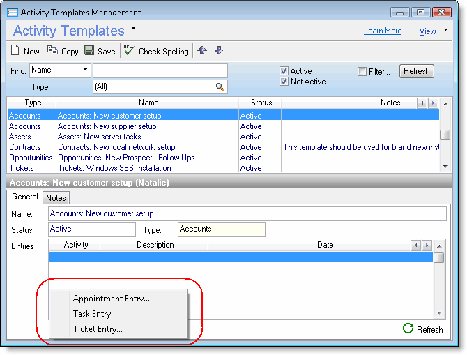 Creating Activity Entries for Accounts To create a new entry in an Account Activity Template, go to the Entries tab of the template and click on the New button in the bottom-left corner. A pop-up menu now appears where you can select “Task,” “Appointment,” or “Ticket.”