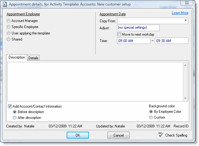 You can also specify whether the Account/Contact information should appear before or after the Appointment Description. To do so, check either the Before Description or After Description box.