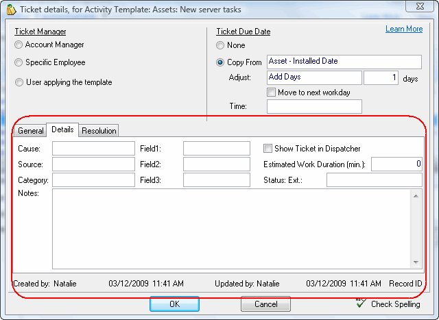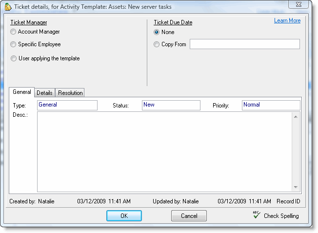 In this window you should enter the information the system can use to create the ticket when the template is applied to an asset.