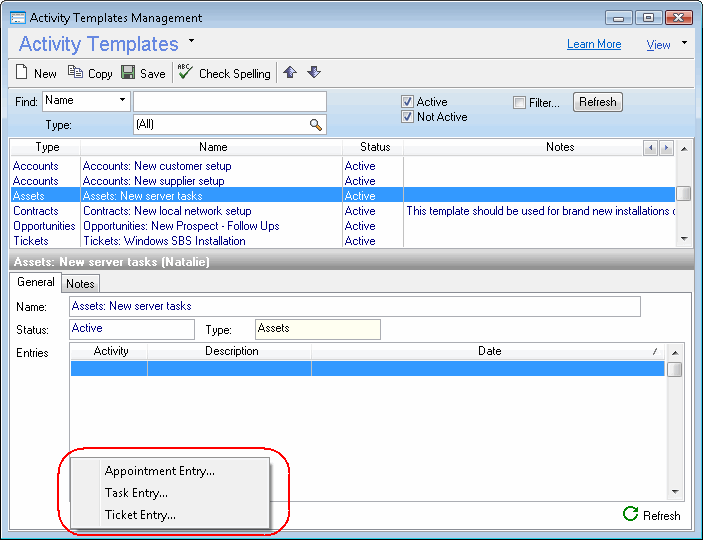 To create a new entry in an Asset Activity Template, go to the Entries tab of the template and click on the New button in the bottom-left corner. A pop-up menu now appears where you can select “Task,” “Appointment,” or “Ticket.”