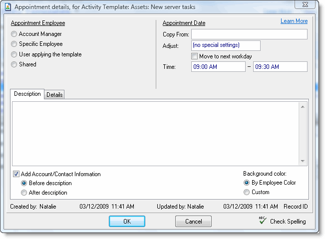 In this box you should enter a description of the appointment. When the template is applied to a specific asset, this field appears as the Appointment Description. If you would like the Account information to be automatically added to this field when the template is applied, you can check the Add Account/Contact info box. Including this information in this field can be helpful when exporting the task to Outlook.