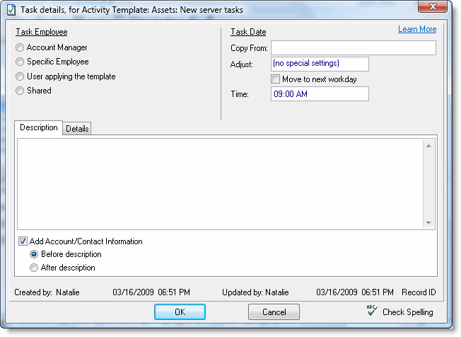 You can also specify whether the Account/Contact information should appear before or after the Task Description. To do so, check either the Before Description box or the After Description box.