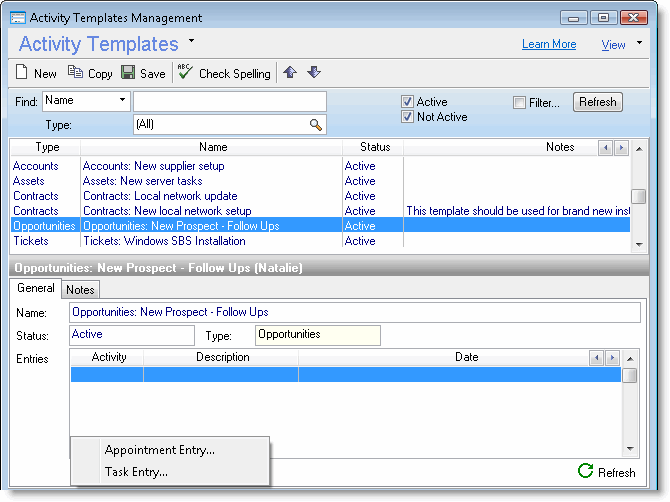 To create a new entry in an Opportunity Activity Template, go to the Entries tab of the template and click on the New button in the bottom-left corner. A pop-up menu now appears where you can select either “Task” or “Appointment.”